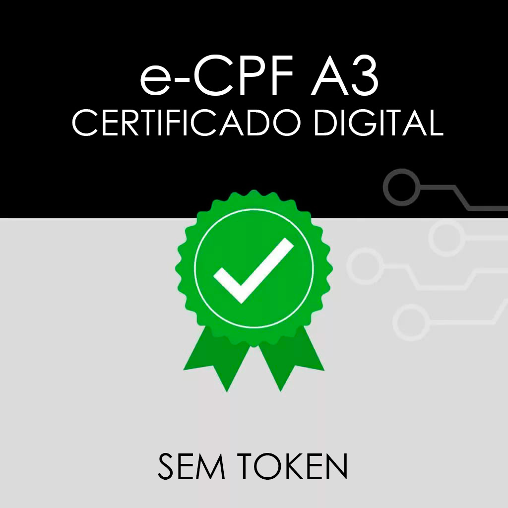 O certificado digital e-CPF A3 em arquivo é uma solução para pessoas físicas no meio eletrônico. Esse certificado está no formato de arquivo e necessita ser instalado em uma mídia (token ou cartão aderente à legislação da ICP-Brasil).